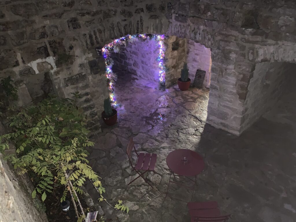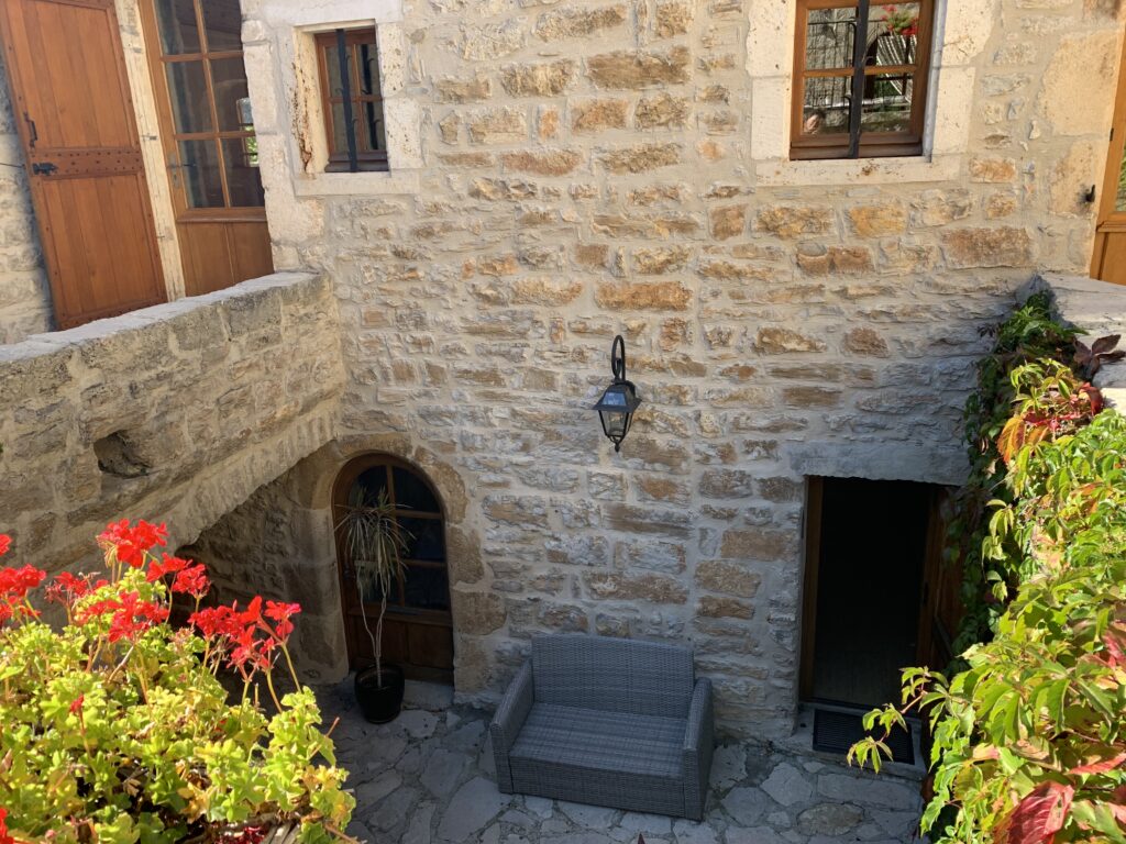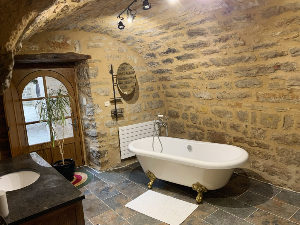Votre chambre donne accès à une salle de bain voûtée en pierre, séparée par un rideau pour plus d’intimité.