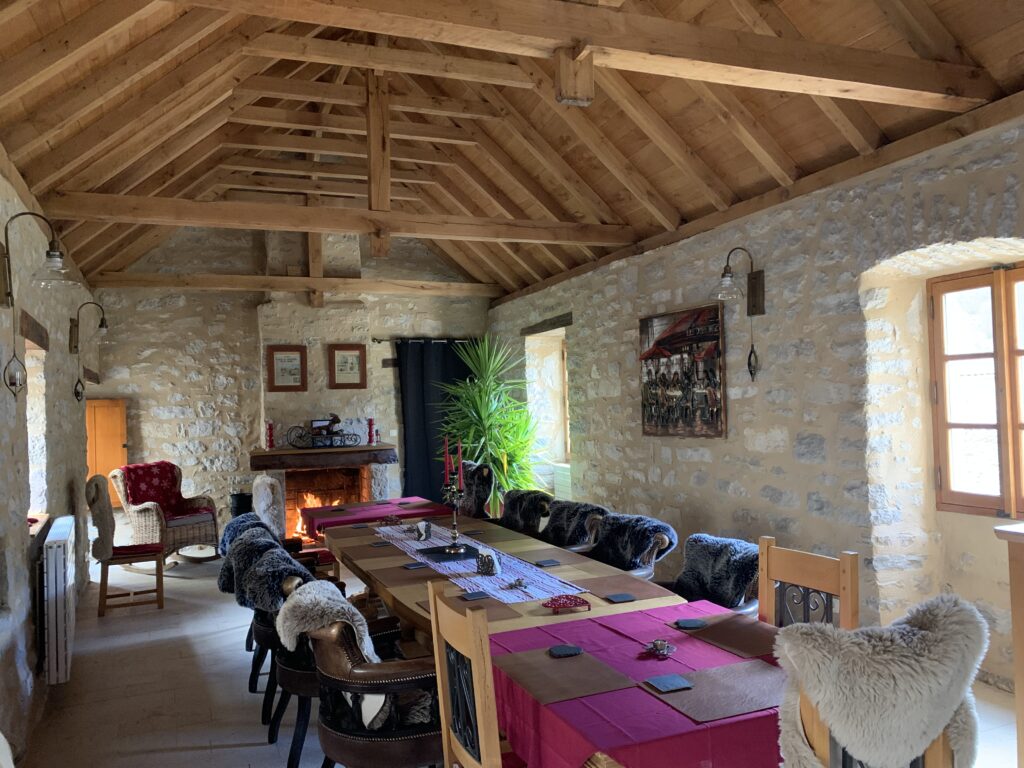 Pour vous retrouver tous ensemble et partager vos repas dans une ambiance conviviale, une sublime salle de réception de 60 m², chaleureuse, avec une charpente cathédrale et une vue sur la montagne.